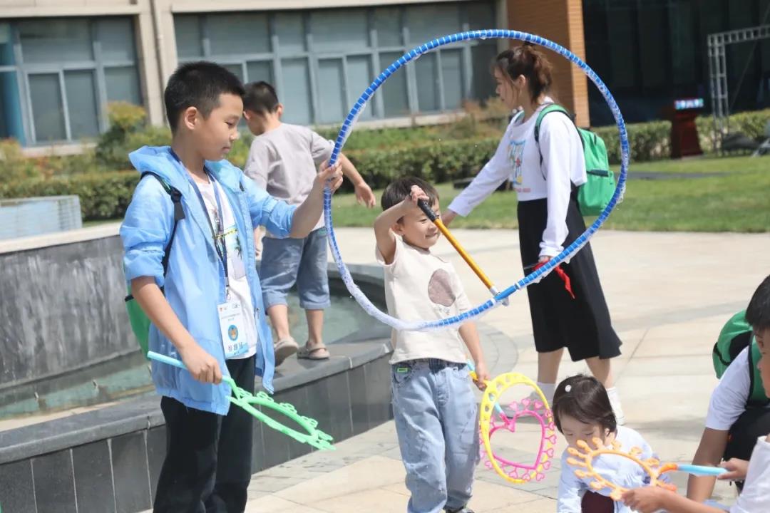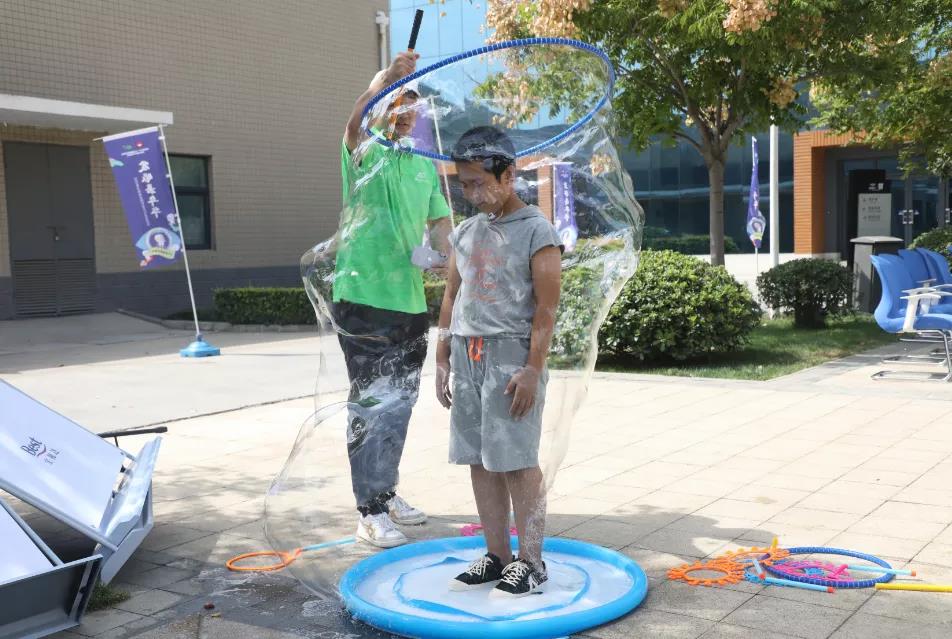 人形泡泡機(jī):泡泡在太陽的照射下五彩繽紛,紛飛在草坪上、樹枝上,像散落的星星飄在空中,孩子們追著泡泡飛來飛去開心極了。還有小朋友感受了一把被泡泡包圍的快樂。