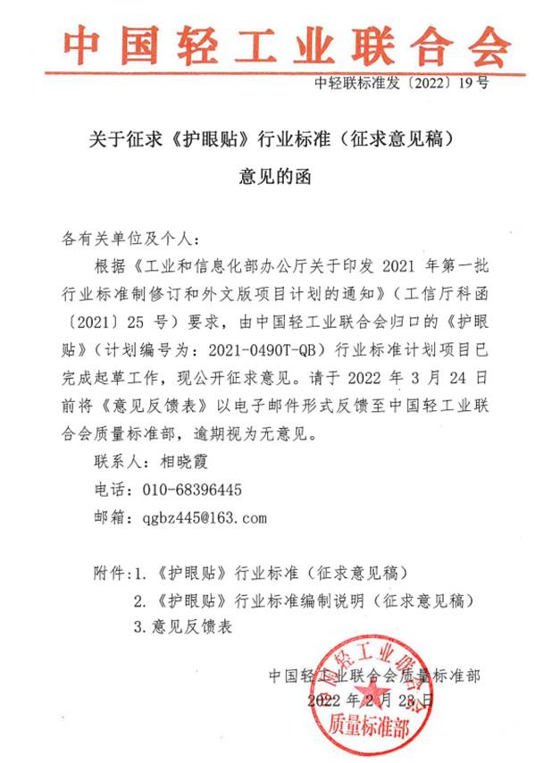 2021年2月,鄭州市新視明科技工程有限公司、北京好視力科技發(fā)展有限公司、陜西新視明醫(yī)藥生物科技有限公司、譜尼測試集團股份有限公司、河南省產(chǎn)品質(zhì)量監(jiān)督檢驗院、云南白藥集團股份有限公司、江西珍視明藥業(yè)有限責(zé)任公司聯(lián)合起草、并歸口于中國輕工業(yè)聯(lián)合會的《護眼貼》行業(yè)標(biāo)準(zhǔn)完成立項工作,并于2022年2~3月完成意見征集工作。該標(biāo)準(zhǔn)規(guī)定了護眼貼的術(shù)語和定義、要求、試驗方法、檢驗規(guī)則、標(biāo)簽、標(biāo)志與說明書、包裝、運輸、貯存及有效期,嚴(yán)格規(guī)范了護眼貼的生產(chǎn)與檢測條件,為規(guī)范護眼貼市場提供了重要的理論依據(jù)。