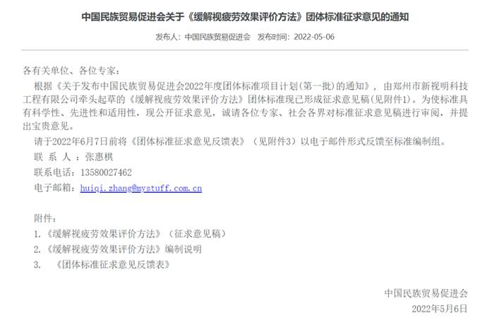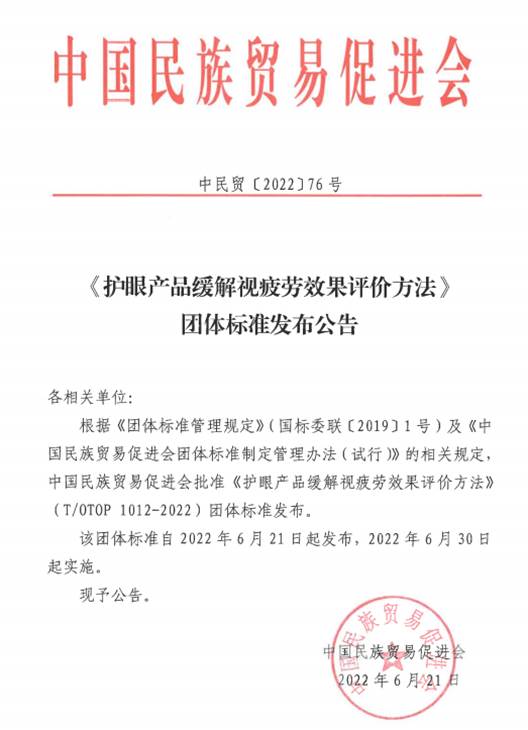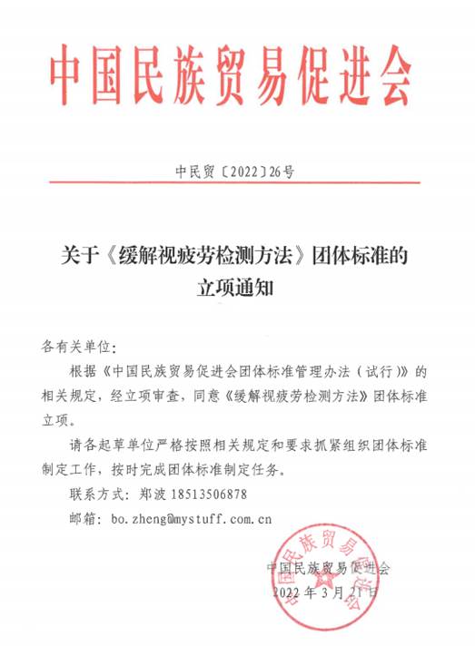 2022年3月,由鄭州市新視明科技工程有限公司、陜西新視明醫(yī)藥生物科技有限公司、北京好視力科技發(fā)展有限公司聯(lián)合起草、并歸口于中國民族貿(mào)易促進會的《護眼產(chǎn)品緩解視疲勞效果評價方法》團體標(biāo)準(zhǔn)完成立項工作,并于2022年5-6月完成意見征集。最終于2022年6月21日完成了標(biāo)準(zhǔn)的發(fā)布。該標(biāo)準(zhǔn)規(guī)定了護眼產(chǎn)品緩解視疲勞效果的總體要求、試驗流程、評價指標(biāo)、數(shù)據(jù)分析和結(jié)果判定的內(nèi)容,適用于研發(fā)、改進或測試護眼產(chǎn)品緩解眼疲勞效果的機構(gòu)或組織,為護眼產(chǎn)品緩解視疲勞效果提供了理論評價依據(jù)。